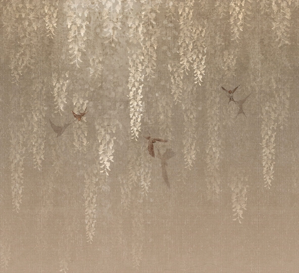 Ten wzór buduje nastrój wyciszenia, jakby przenosił do miejsca, w którym czas zwalnia, a przestrzeń oddycha. Kompozycja oparta na zwiewnych, opadających gałązkach i subtelnie unoszących się ptakach tworzy wrażenie lekkości oraz harmonii. Malarska, miękka faktura podkreśla współczesny charakter projektu, zachowując przy tym naturalną, kojącą ekspresję. To propozycja do wnętrz, w których liczy się delikatny detal i elegancka obecność motywu botanicznego. Fototapeta sprawdzi się zarówno jako główna ściana aranżacji, jak i tło budujące atmosferę spokoju. Jej estetyka doskonale współgra z nowoczesnymi kierunkami, takimi jak skandynawski minimalizm, japandi czy subtelne boho.