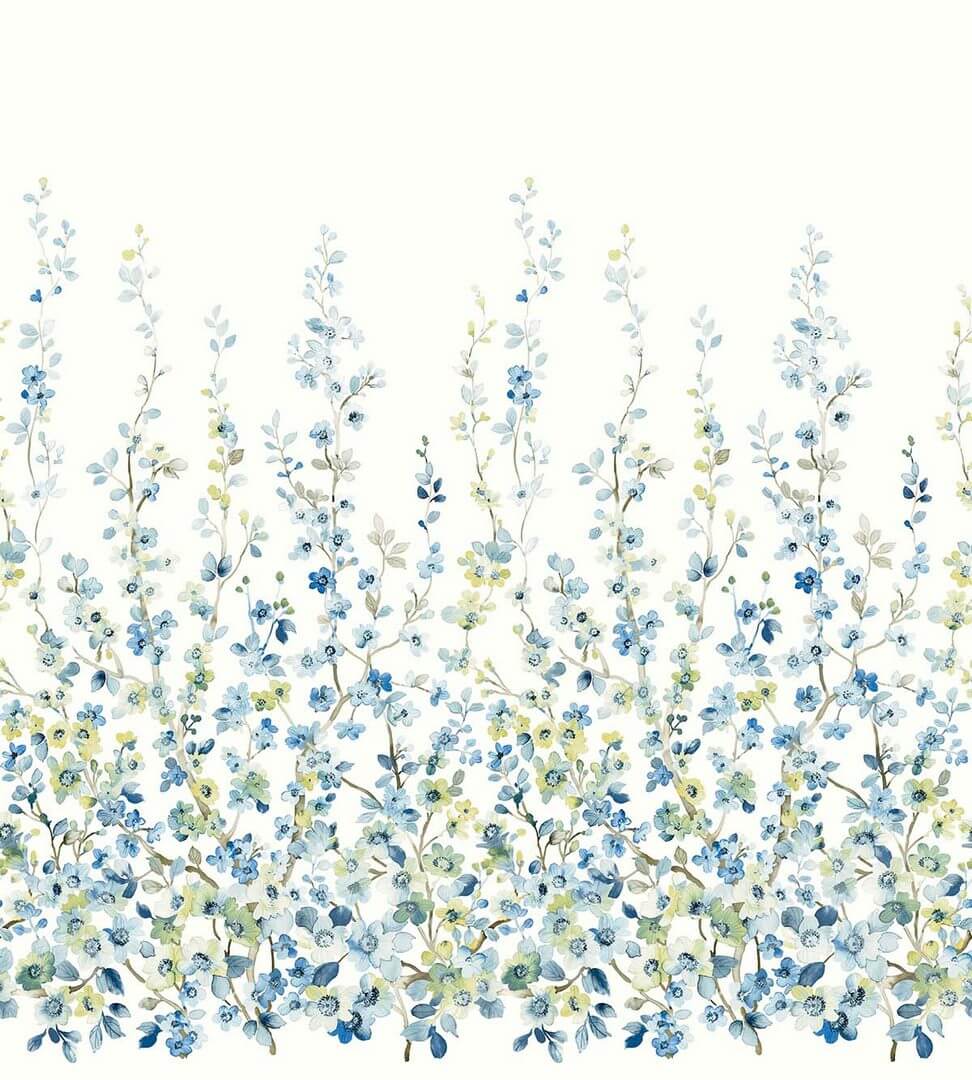 Wzór tworzą roślinne pnącza i drobne kwiaty, układające się w delikatną, pionową kompozycję. Poszczególne gałązki zdają się wyrastać z dolnej strefy i prowadzić wzrok ku górze, co optycznie porządkuje proporcje ściany. Motyw jest bogaty w szczegóły, ale zachowuje wrażenie lekkości dzięki subtelnemu rysunkowi i akwarelowej miękkości. Dzięki temu mural dobrze współgra zarówno z prostymi, minimalistycznymi bryłami, jak i z bardziej dekoracyjnymi dodatkami. To rozwiązanie, które pomaga stworzyć spójną aranżację bez konieczności mnożenia ozdób w całym pomieszczeniu. Kompozycja najlepiej prezentuje się jako dominanta na jednej ścianie, pozwalając pozostałym powierzchniom pozostać spokojnym tłem.