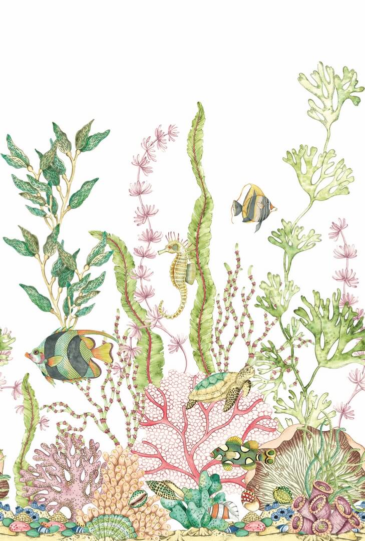 Scena przedstawia podwodny ogród z bogatą roślinnością: wodorostami, glonami i delikatnymi, falującymi formami przypominającymi morskie łąki. Wśród koralowców i struktur rafy pojawiają się stworzenia morskie, które ożywiają kompozycję i nadają jej opowieściowy charakter. Z łatwością można dostrzec ryby oraz pławikonika, a także muszle i elementy rafy koralowej budujące naturalne tło. Układ motywów jest zróżnicowany, dzięki czemu mural wygląda dynamicznie i nie sprawia wrażenia płaskiej grafiki. Detale są dopracowane w sposób, który dobrze prezentuje się zarówno z bliska, jak i z większej odległości. To dekoracja, która potrafi stać się tematem przewodnim wnętrza, a jednocześnie pozostaje elegancka i spójna.