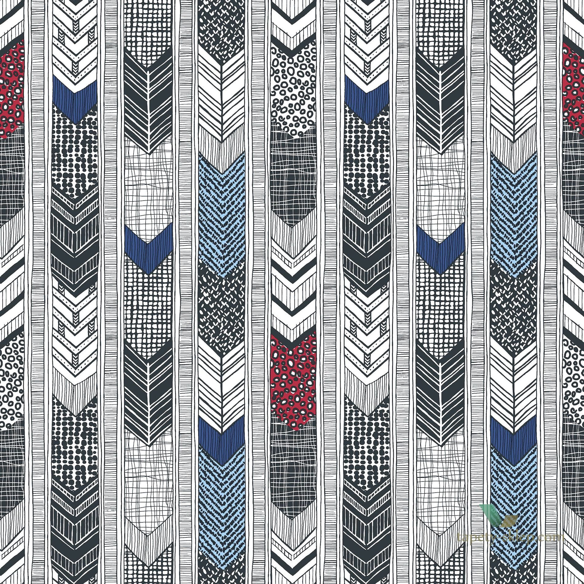 Tapeta Galerie w etnicznym stylu ozdobiona wzorem przypominającym pióra. Wzór układa się w pionowe pasy z indiańskimi wzorami. Kolekcja Global Fusion czerpie inspirację z różnorodnych kultur.