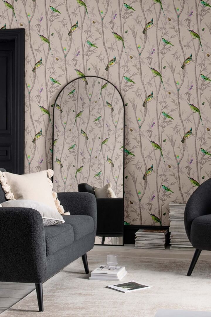 Tapeta botaniczna w stylu chinoiserie przedstawia ptaki, motyle, ważki oraz inne owady, które przesiadują wśród pędów bambusów. Projekt pochodzi z kolekcji Next, która obejmuje szeroką gamę stylów i kolorów, dzięki temu tapety z tego zbioru pasują do każdego wnętrzarskiego stylu. Od eleganckich kwiatów, przez współczesną geometrię, po projekty do dziecięcego pokoju. Każdy z nas znajdzie tu coś dla siebie. Tapety staną się idealnym akcentem na dekoracyjnej ścianie, pozwolą także wydzielić daną strefę w pomieszczeniu. Kolekcja Next to nie tylko różnorodność wzorów, ale także bogata kolorystyka, spotkamy tu zarówno zawsze modne beże i szarości, jak i tajemnicze granaty, radosne zielenie czy wyjątkowy pudrowy róż. Tapety Next odnajdą się w aranżacji domowych wnętrz, bardzo dobrze zaprezentują się w salonie, sypialni czy jadalni.